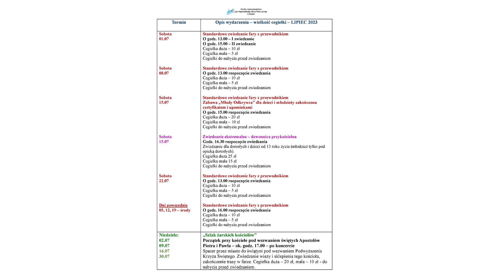Szanowni Państwo, oto harmonogram zwiedzania na lipiec. Zapraszamy już w najbliższy weekend. W przypadku chęci poznania fary (osoby indywidualne, grupy)