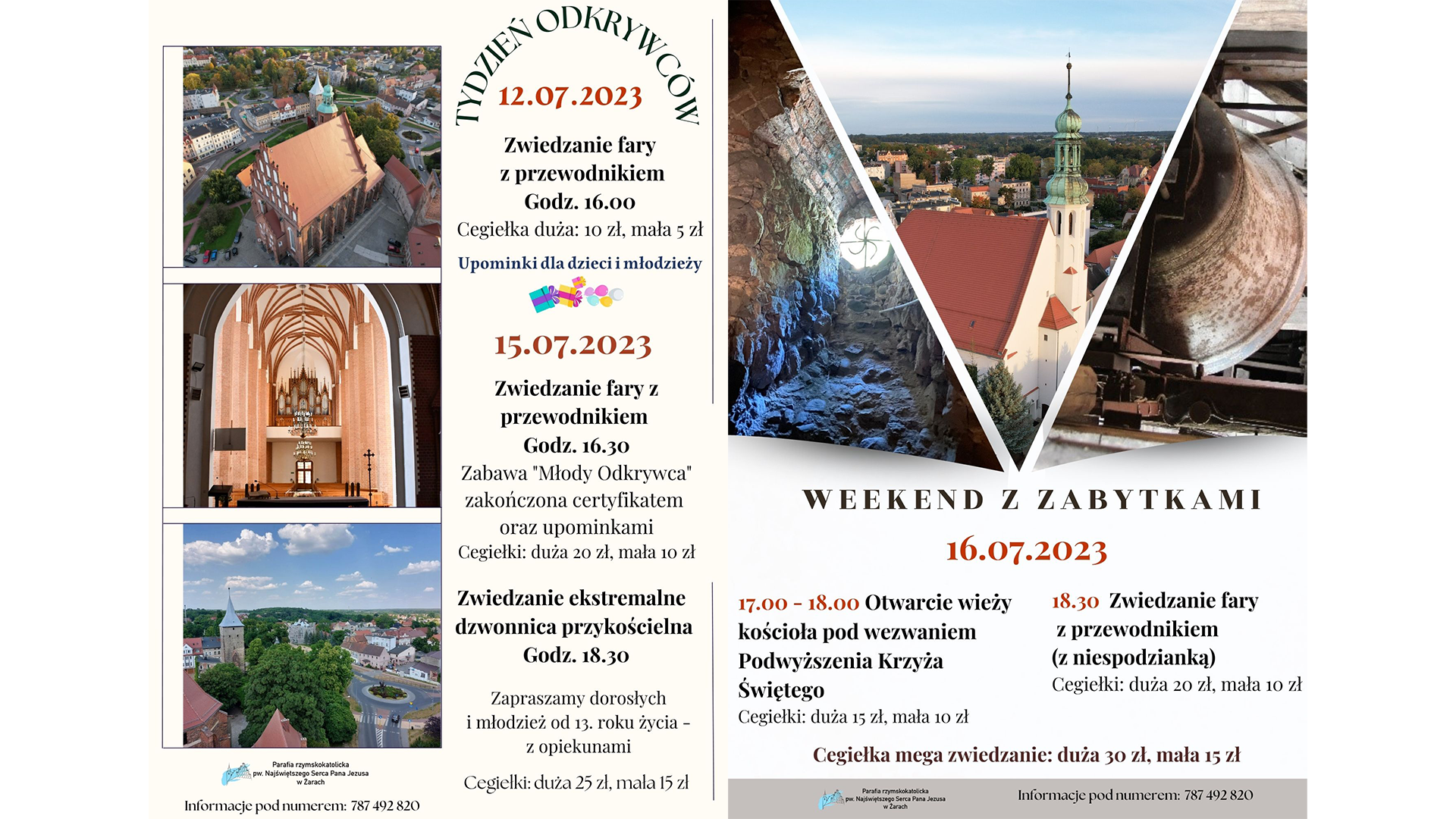 Zapraszamy do zwiedzania obiektów należących do parafii Najświętszego Serca Pana Jezusa w Żarach, tj. kościołów: Najświętszego Serca Pana Jezusa, św. Ap. Piotra i Pawła oraz Krzyża Św. oraz dzwonnicy przy kościele farnym w trzech formach: indywidualnie, grupowe oraz podczas wydarzeń organizowanych przez parafię.