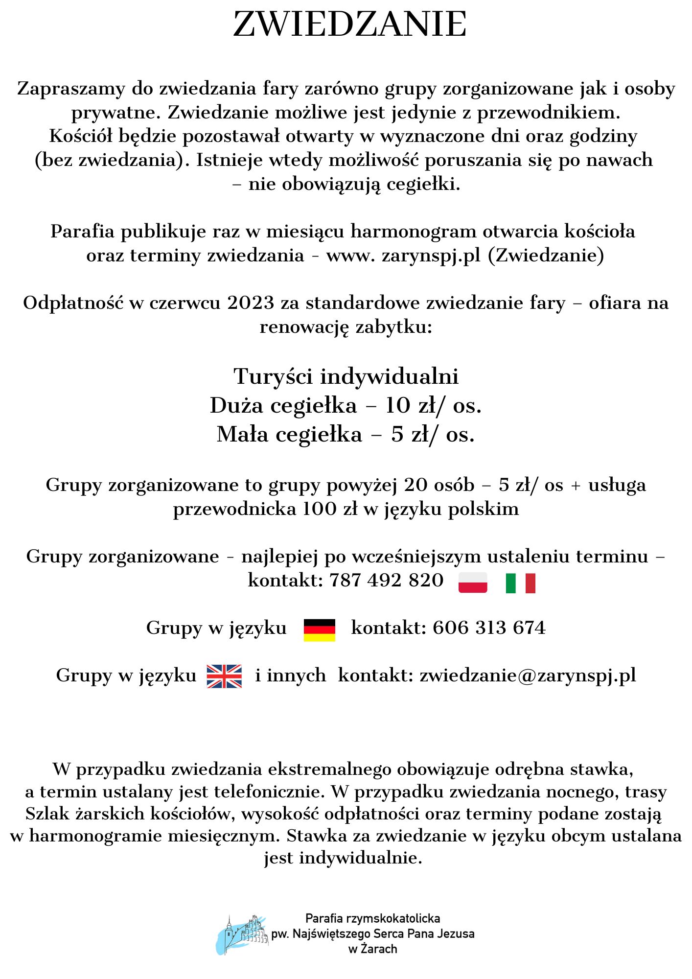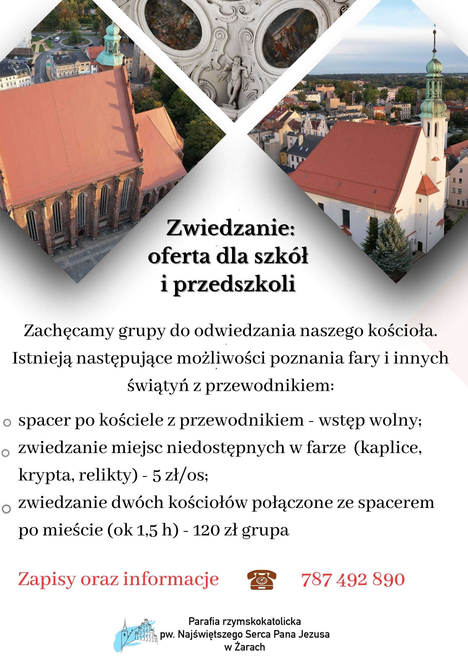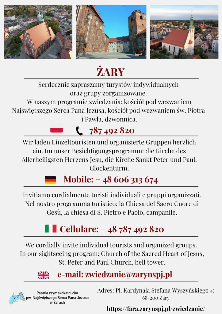 Zapraszamy do zwiedzania obiektów należących do parafii Najświętszego Serca Pana Jezusa w Żarach, tj. kościołów: Najświętszego Serca Pana Jezusa, św. Ap. Piotra i Pawła oraz Krzyża Św. oraz dzwonnicy przy kościele farnym w trzech formach: indywidualnie, grupowe oraz podczas wydarzeń organizowanych przez parafię.